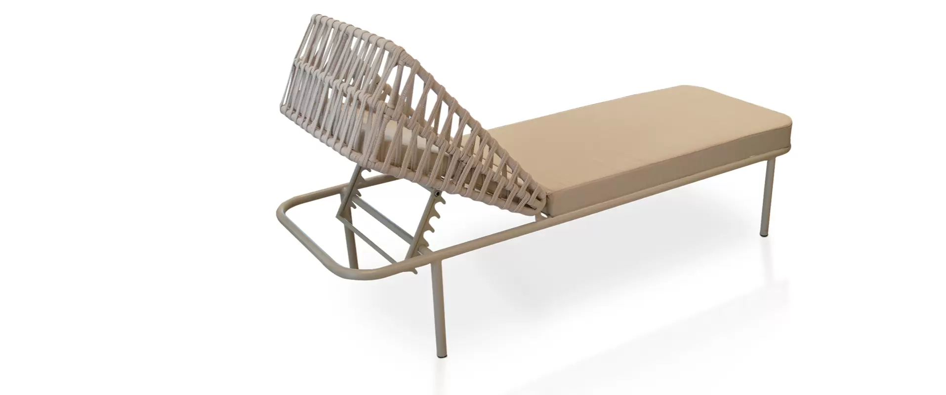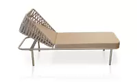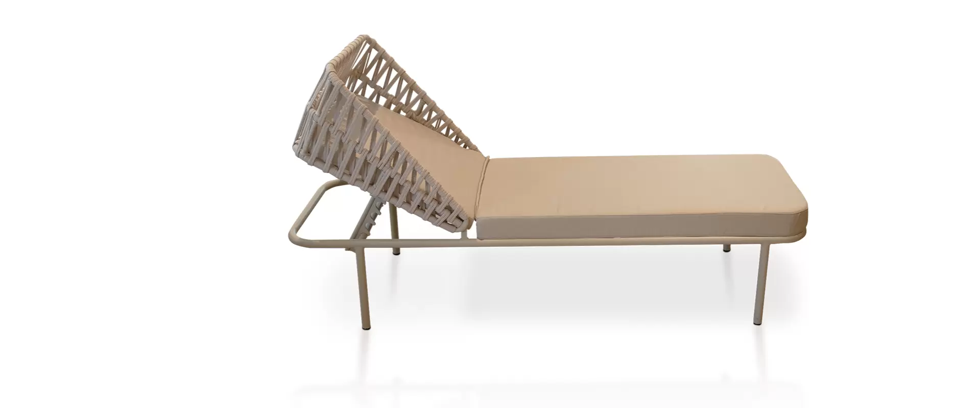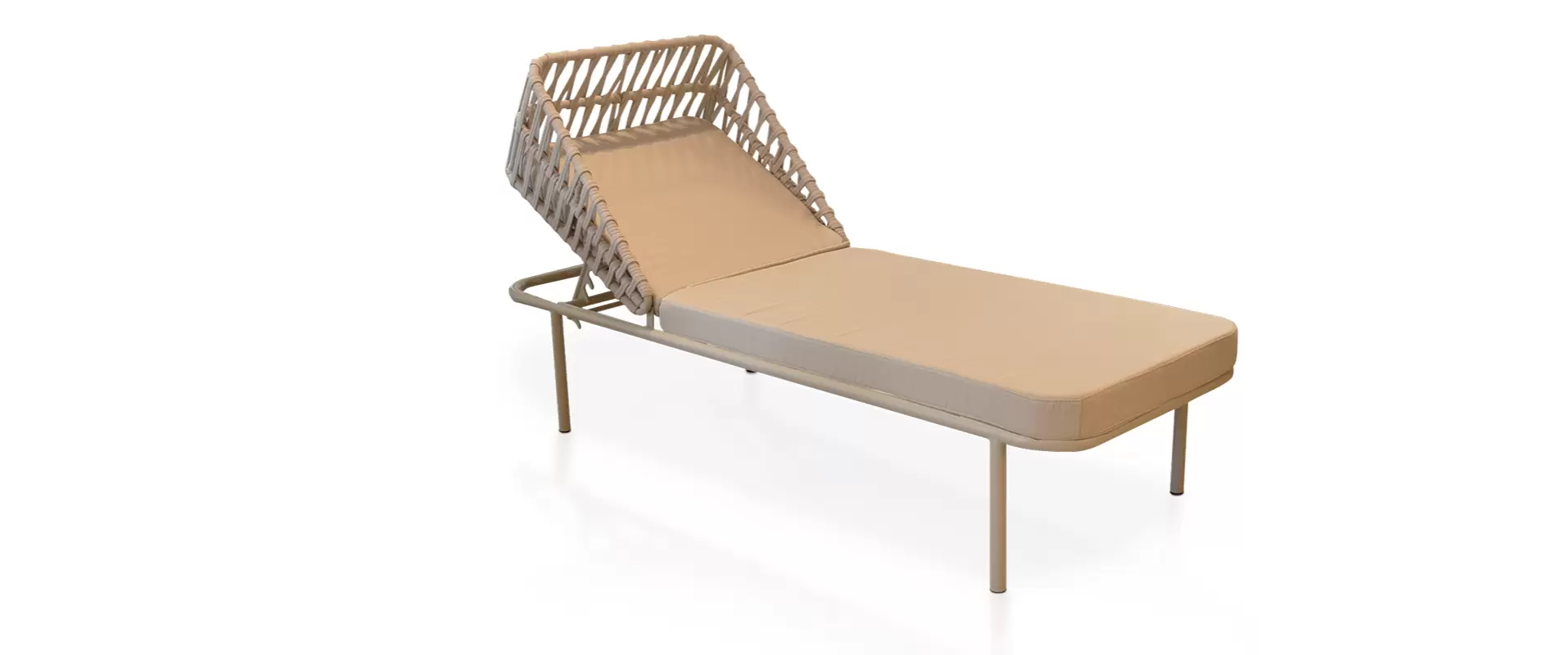 A Chaise 650 foi criada para proporcionar conforto absoluto com estética contemporânea e acabamento artesanal. Seu design combina uma estrutura em alumínio, leve e resistente, com um encosto ajustável envolvente trabalhado em tricô náutic trançado manualmente, formando um desenho geométrico que valoriza a peça e acrescenta textura, movimento e personalidade ao ambiente.