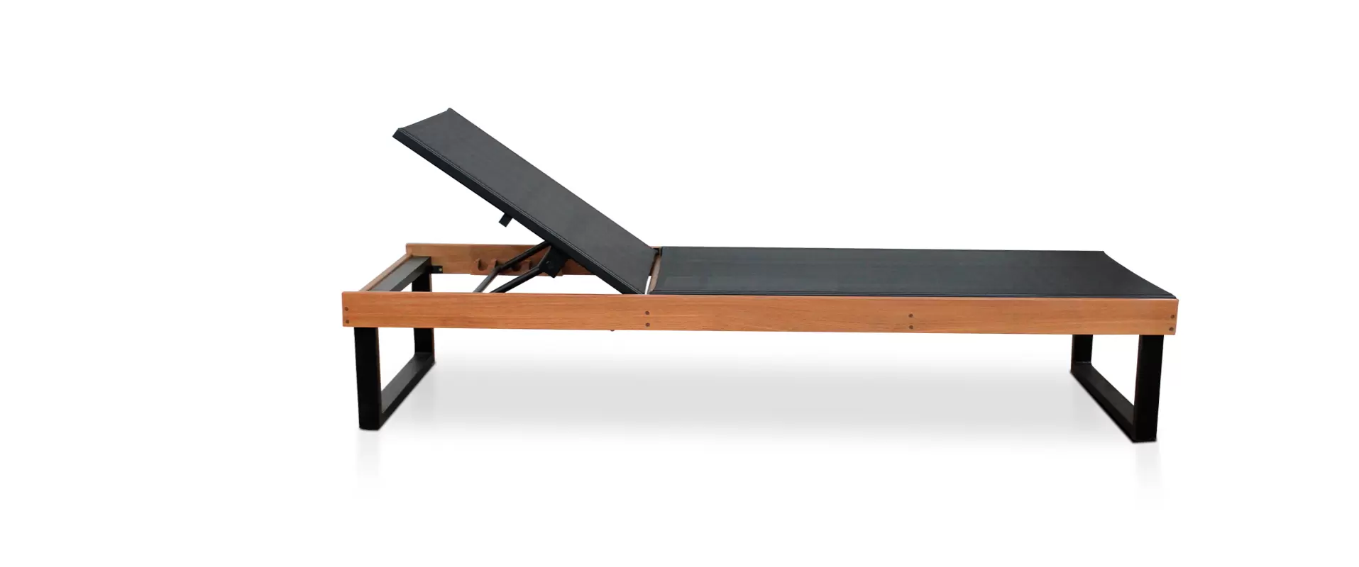 A espreguiçadeira em alumínio com base em madeira cumaru e tela sling é a prova de que sofisticação e natureza podem coexistir em perfeita harmonia.