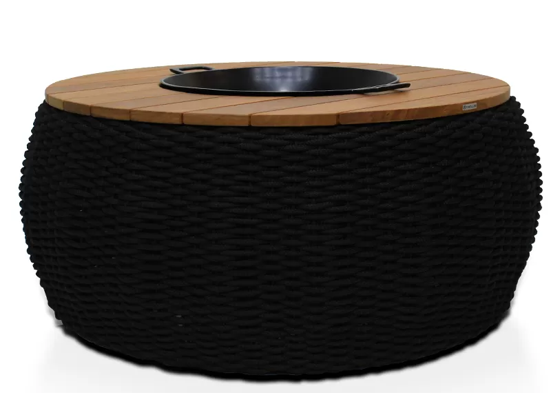 O tampo ripado em madeira cumaru, com sua beleza natural e resistência, adiciona um toque de rusticidade e aconchego, criando um contraste perfeito com a suavidade da fibra sintética.