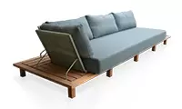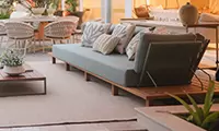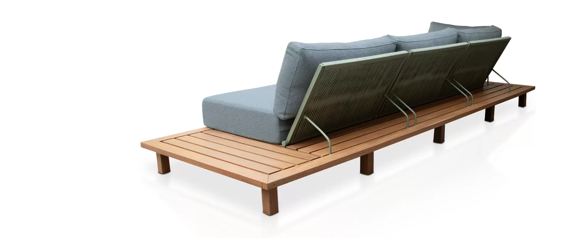 A base em cumaru com superfície ripada em madeira maciça, funciona não apenas como apoio funcional, mas também como elemento decorativo, tornando o sofá mais versátil e adaptável a diferentes composições de ambiente. O encosto combina estrutura em alumínio com um sofisticado trabalho em corda náutica, trançado de forma manual e precisa, resultando em um visual geométrico, moderno e extremamente elegante.