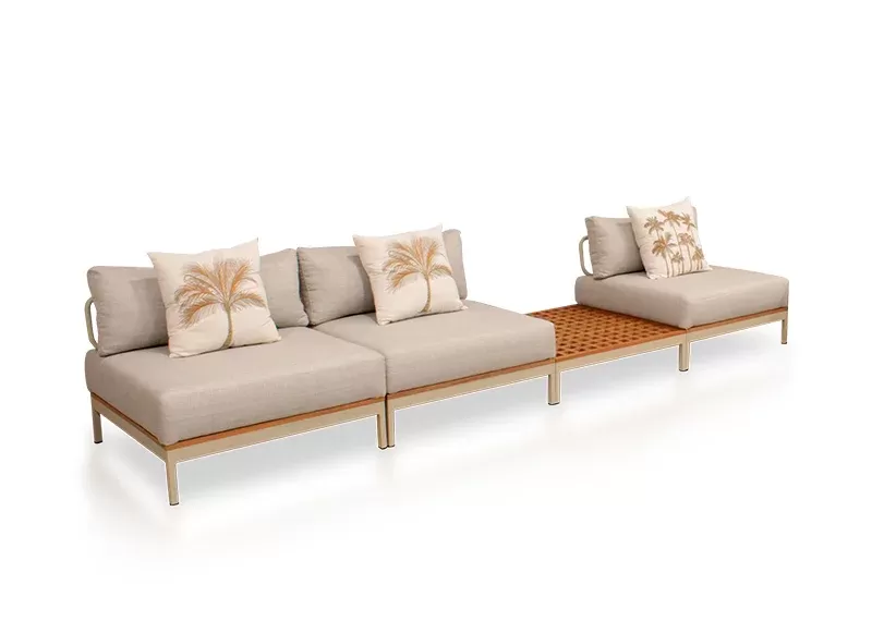 A estrutura em alumínio, leve e resistente, garante durabilidade e um design moderno. A base em madeira cumaru estilo muxarabi adiciona um toque de sofisticação e elegância, enquanto o assento estofado proporciona um conforto incomparável. O encosto almofadado, acompanhado de almofadas decorativas, convida a momentos de relaxamento.