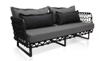 A estrutura em alumínio, leve e resistente, garante durabilidade e um design moderno. O revestimento em tricô náutico, trabalhado à mão, confere à peça um toque artesanal e exclusivo, além de proporcionar uma textura agradável ao toque. O assento estofado com espuma de alta densidade garante o máximo conforto, enquanto as almofadas acompanham o design sofisticado da peça.