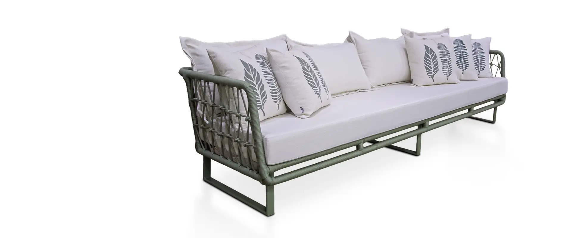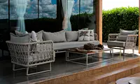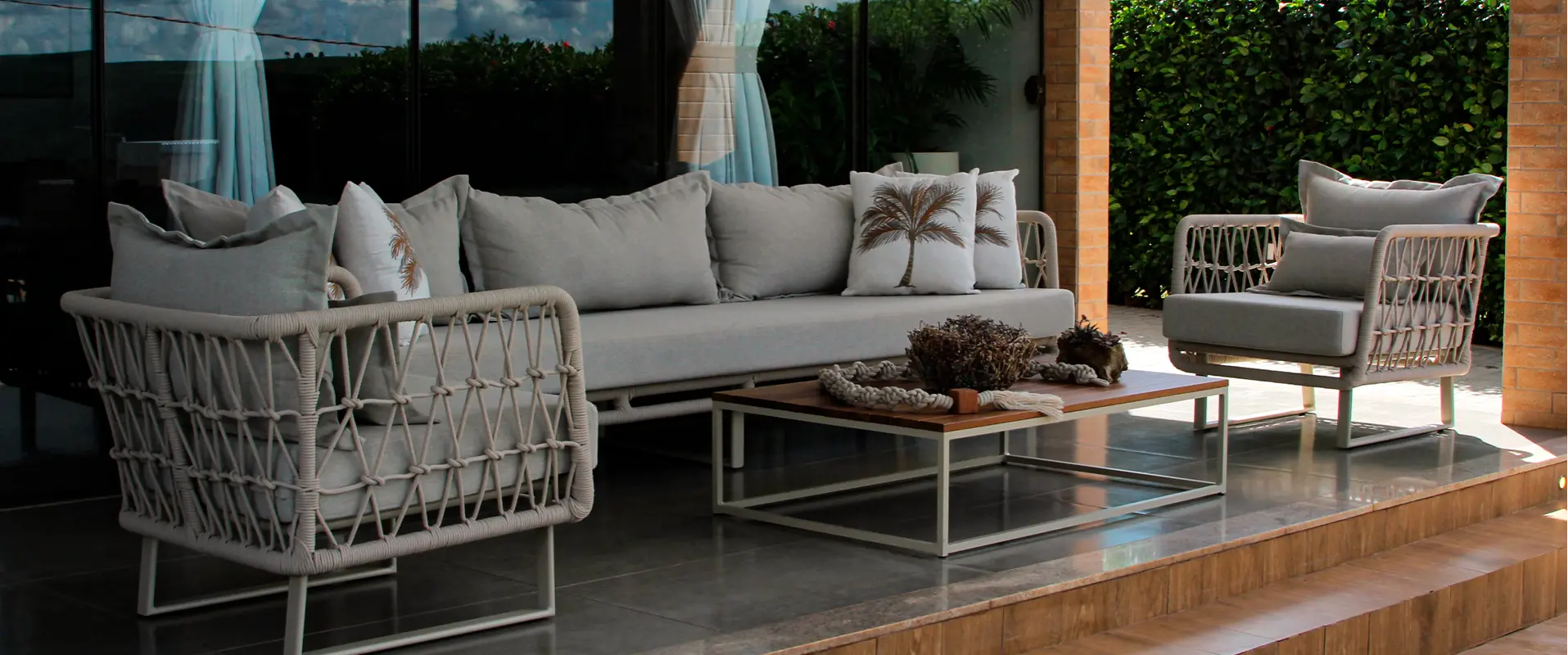 Sua estrutura em alumínio garante resistência às intempéries e longa vida útil, enquanto o acabamento em corda náutica adiciona leveza visual e um toque artesanal sofisticado. O assento amplo e as almofadas estofadas proporcionam excelente conforto, tornando a peça ideal para varandas, áreas gourmet, jardins e espaços ao redor da piscina.